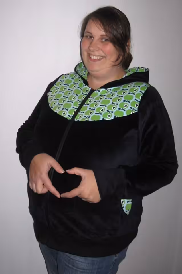Genäht wird sie aus allen dehnbaren Stoffen wie Nicky, Sweat, Jersey, Interlock usw.