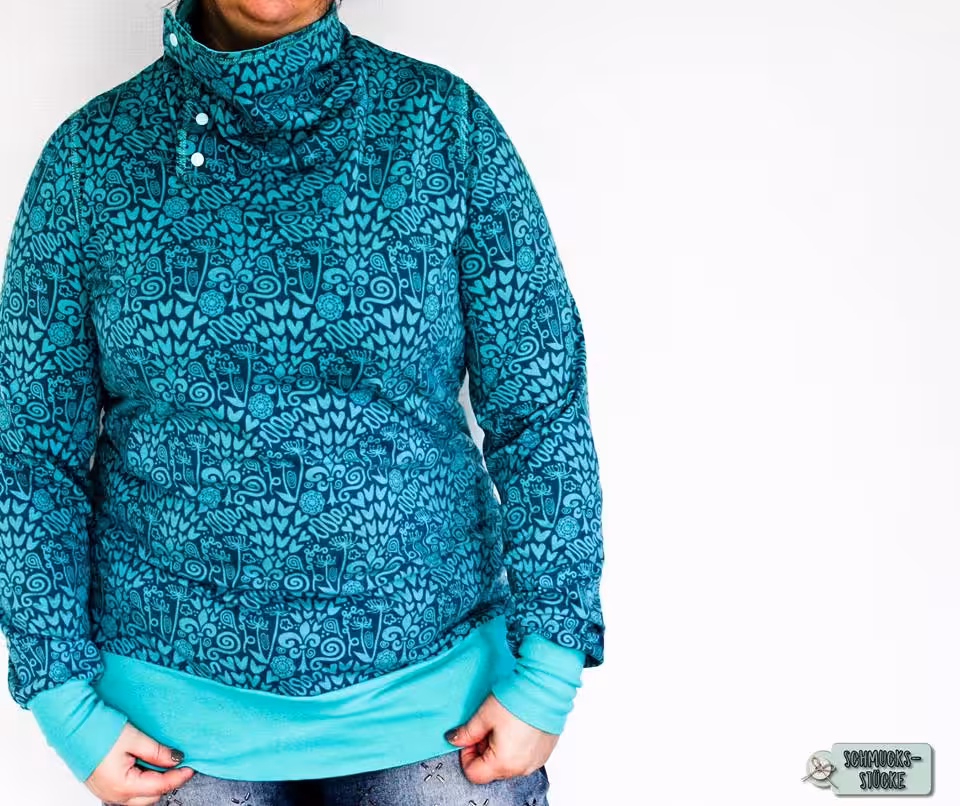 Konzipiert ist er für mitteldicke bis dicke Stoffe wie Sweat, Stretchfrottee, Nicky, Fleece, Strickfleece und andere Strickstoffe. Prinzipiell kann der Schnitt auch aus Jersey genäht werden, hier empfehle ich dann einen nicht zu dünnen.
