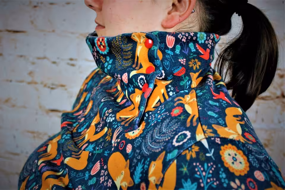 Big Lady Serena ist ein Hoodie mit 2 Varianten. Du kannst zwischen Kapuze und knöpfbarem Kragen wählen. Weite und Länge fallen normal aus. Serena wird aus dehnbaren Stoffen genäht.