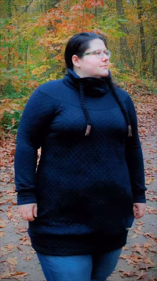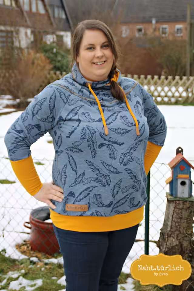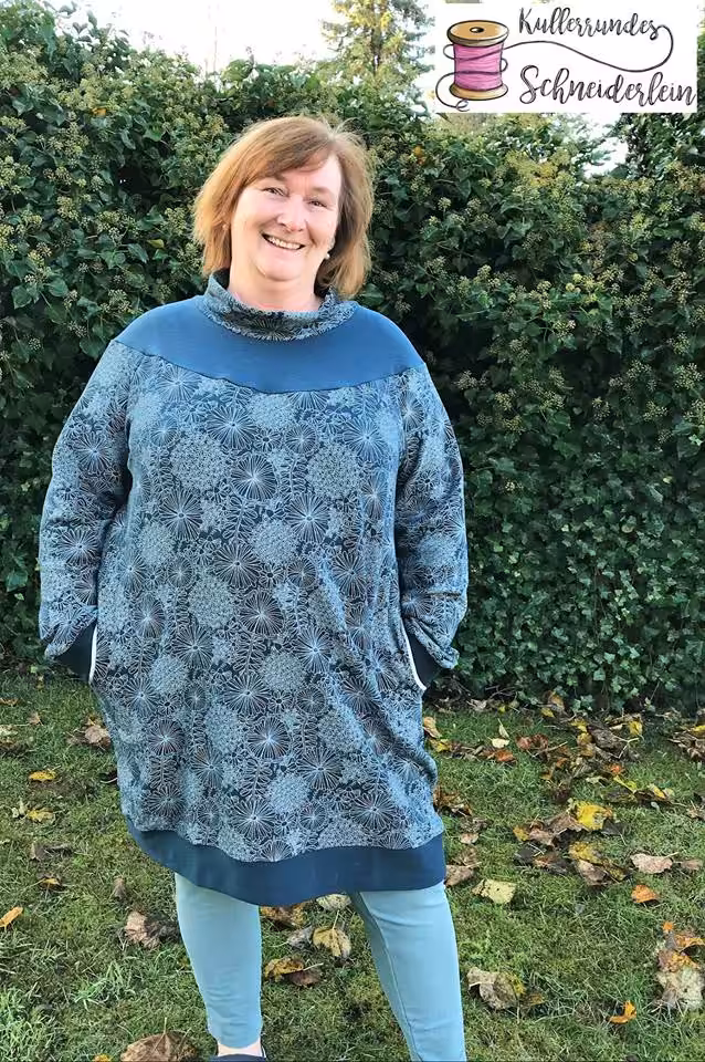 Die Passform ist normal, der Schnitt ist weder eng noch weit. Genäht wird Big Lady Tasja aus allen dehnbaren Sweatstoffen, Fleece, Alpenfleece und Strickstoffen.