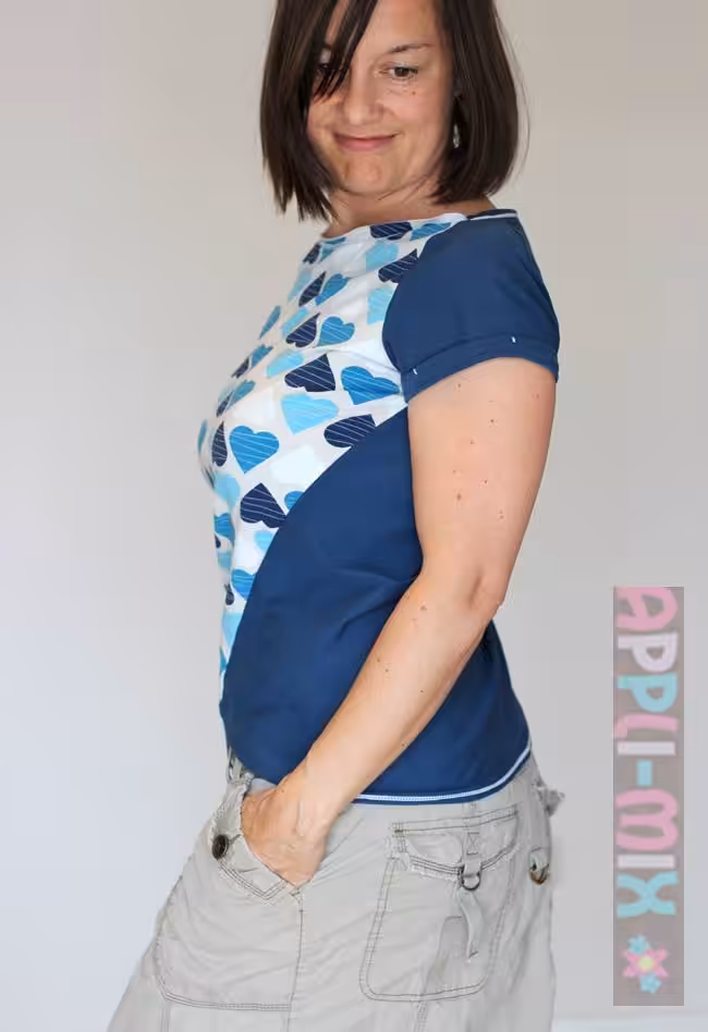 Lady Aimee sitzt leger. Du kannst daraus sowohl ein Shirt als auch einen Pulli nähen. Die vordere Teilung bietet viele schöne Kombinationsmöglichkeiten. Der Schnitt ist ganzjahrestauglich und super schnell und einfach genäht.