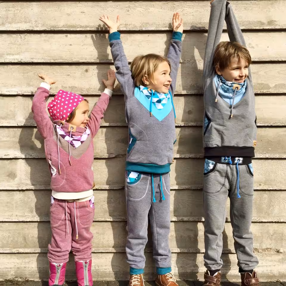 Sie kann aus allen Sweatstoffen, Jersey und sonstigen dehnbaren Stoffen genäht werden.
