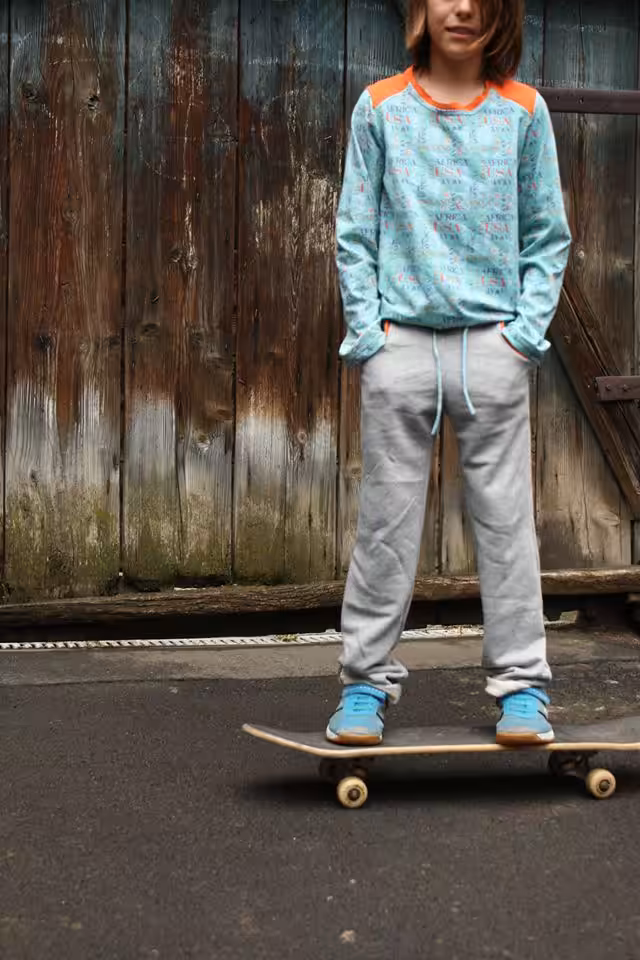 Haven ist eine schmale Sweathose. Sie kann mit oder ohne Taschen genäht werden. Im Stoff- oder Mustermix kann sie cool wirken, oder nach Wunsch auch ganz schlicht als Basic genäht werden.