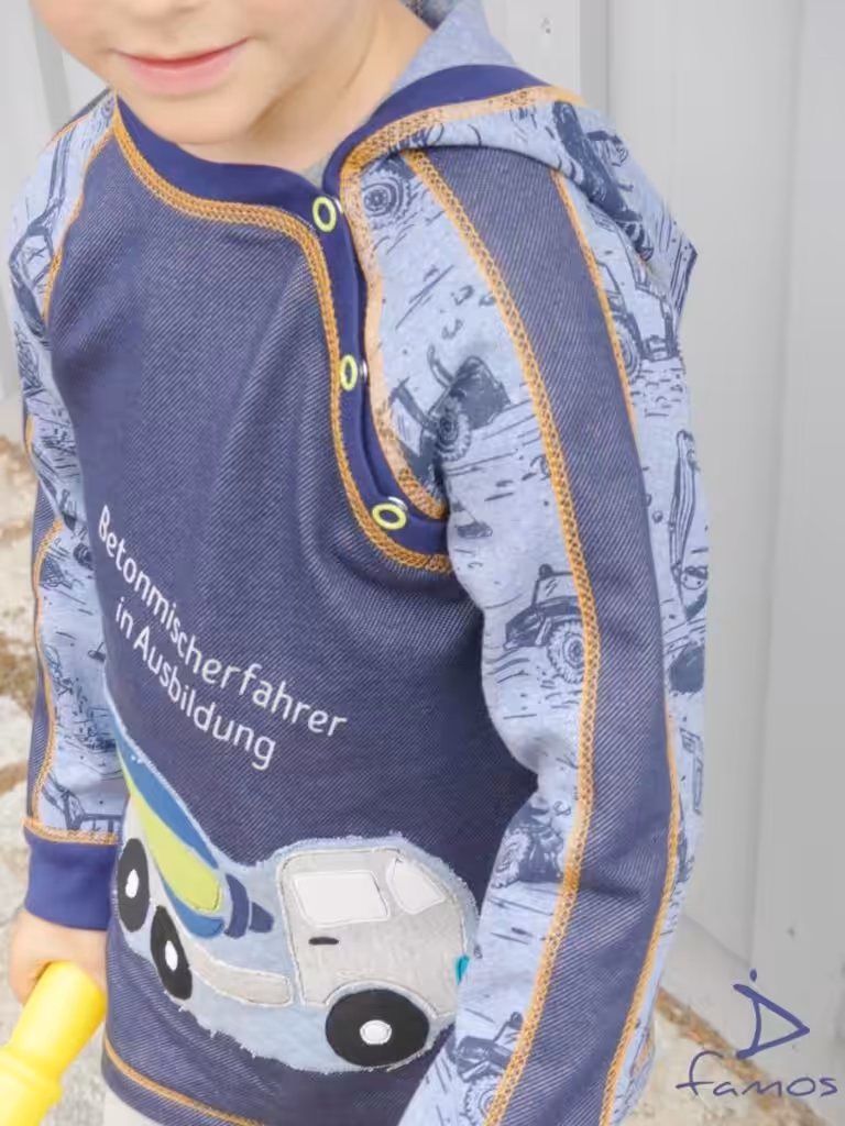 Joe“ ist ein Schnitt mit vielen Möglichkeiten. Er kann mit geteiltem oder ganzem Ärmel, mit oder ohne Kapuze genäht werden.