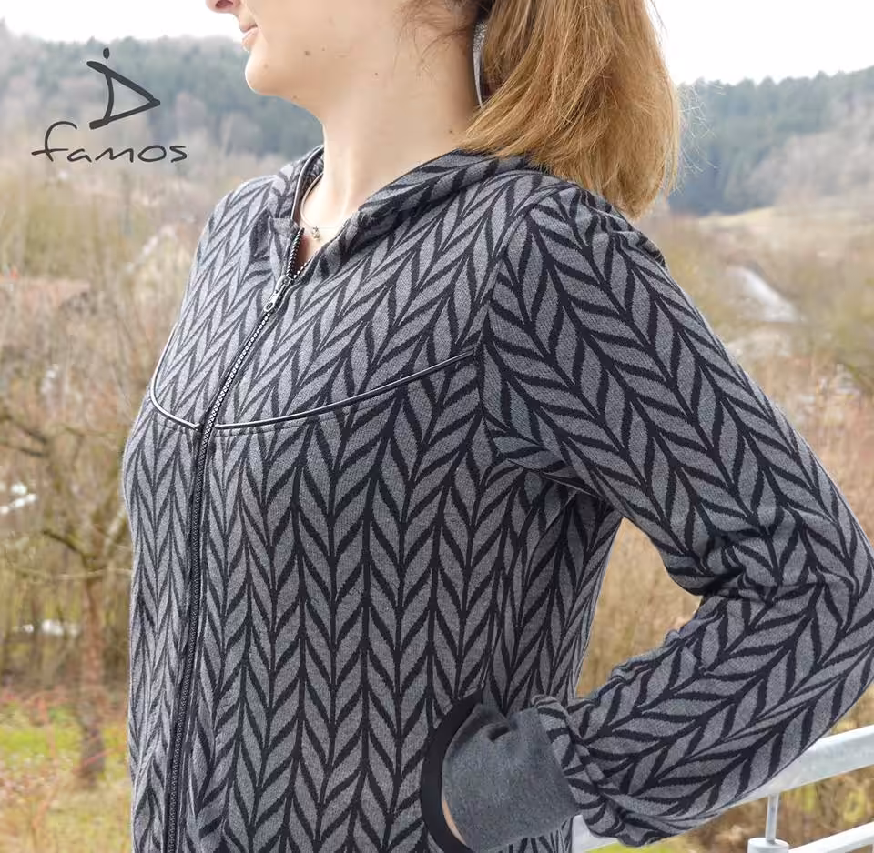 Genäht wird sie aus allen dehnbaren Stoffen wie Nicky, Sweat, Jersey, Interlock usw.