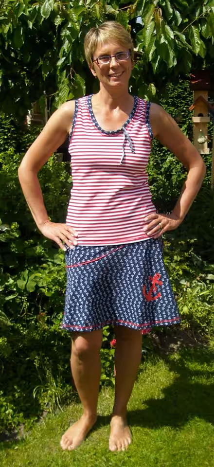 Lady Rosalie ist ein Sommertop mit einigen Varianten. Es kann als enge oder ausgestellte Version und in 2 Längen genäht werden. Den besonderen Look erhält es, wenn in einen Tunnel aus Bündchen ein Band oder Jerseystreifen eingezogen und zur Schleife geknotet wird. Selbstverständlich kann darauf auch verzichtet werden. Lady Rosalie kann aus Jersey, Interlock und leichten Strickstoffen genäht werden.
