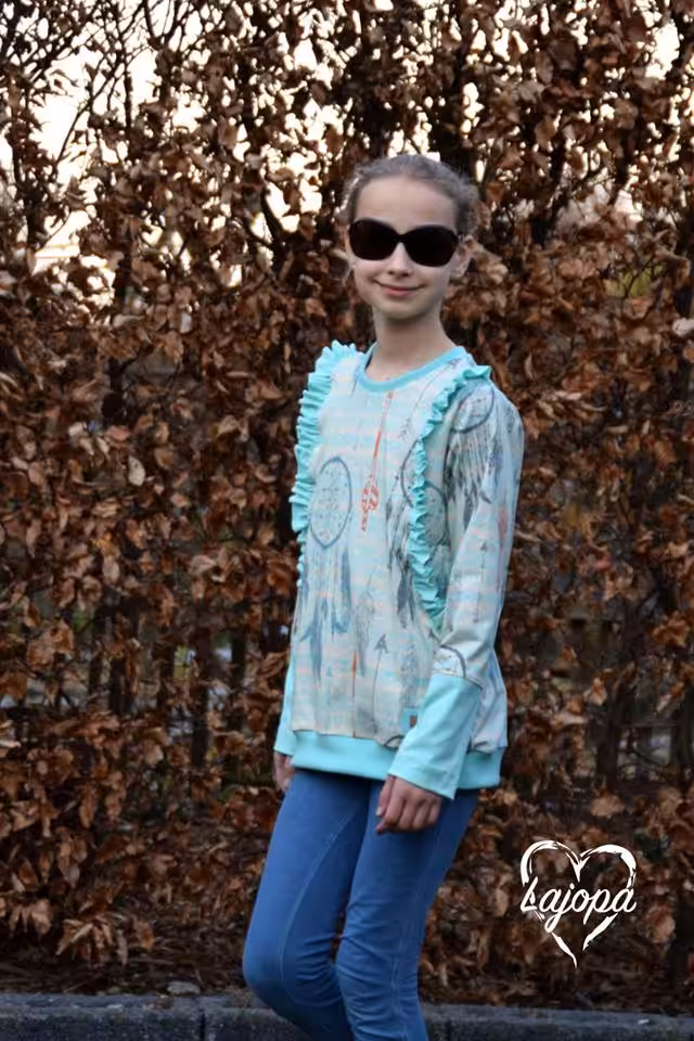 Genäht wird das Sweatshirt aus wärmeren Sweatstoffen wie Wintersweat oder angerautem Sweat.